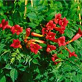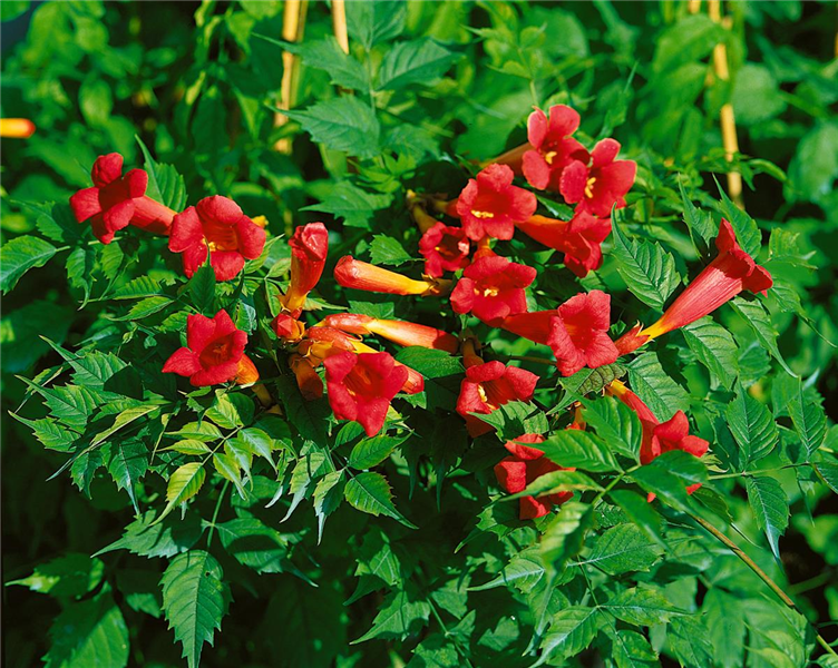 Von Juni bis September bringt Campsis x tagliabuana 'Fire Trumpet Vine'® leuchtend rote Blüten hervor.