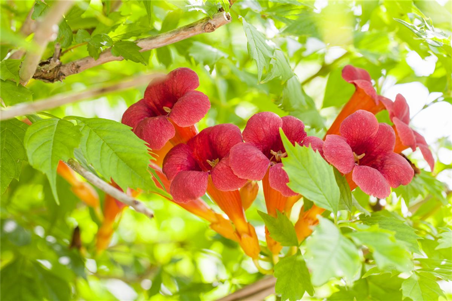 Von Juni bis September bringt Campsis x tagliabuana 'Summer Jazz Fire'® rote Blüten hervor.