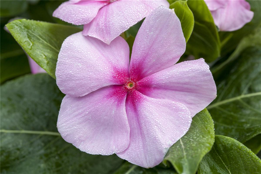 Von Mai bis Oktober bringt Catharanthus roseus rosafarbene Blüten hervor.
