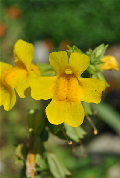 Von Juni bis August bringt Mimulus luteus rachenförmige, gelbe Blüten hervor. Sie sind in Trauben angeordnet.
