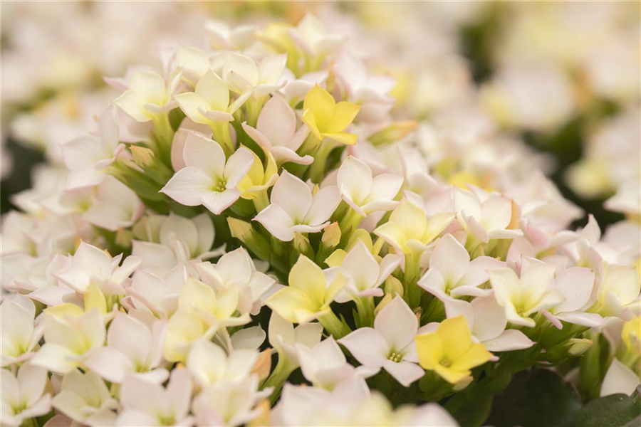 Von Februar bis Juni bringt Kalanchoe blossfeldiana 'Calanday® Discodip' sternförmige, mehrfarbige Blüten hervor. Sie sind in Dolden angeordnet.