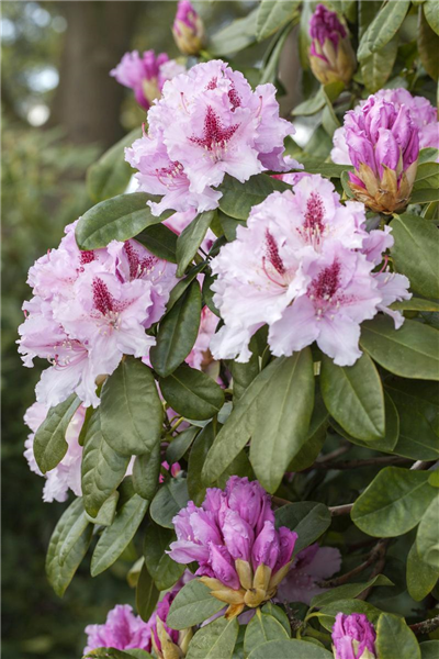 Rhododendron 'Progrès' harmoniert besonders gut mit Glanzmispel und Japanische Fruchtskimmie.