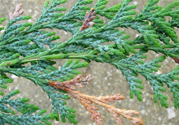 Die Triebspitzen von Scheinzypressen (Chamaecyparis) sind braun verfärbt. Bei genauerer Untersuchung kann man feststellen, dass die geschädigten Zweigspitzen innen hohl gefressen und mit schwarzen Kotkrümelchen gefüllt sind.