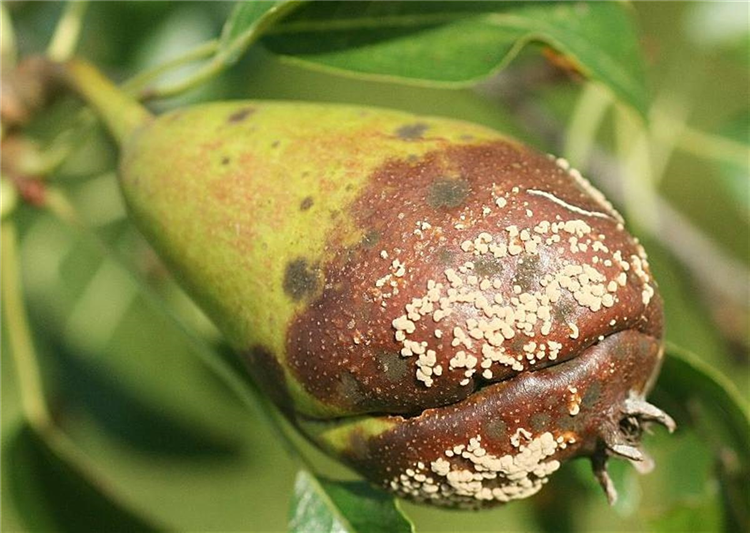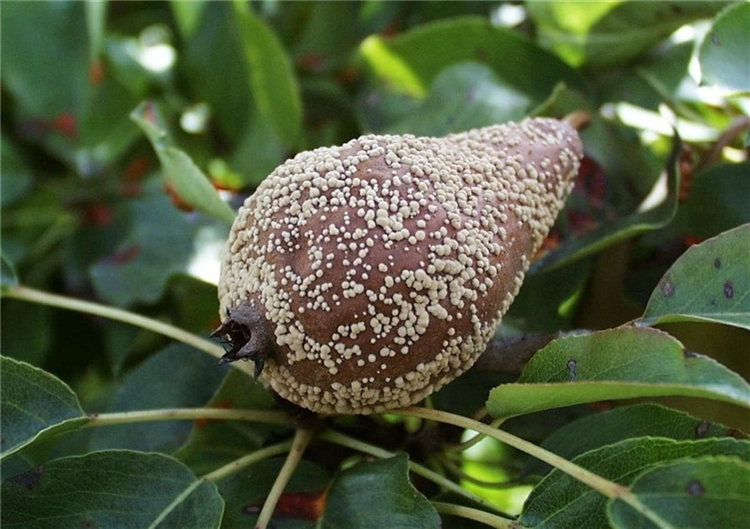 Die Sporen des Monilia-Pilzes (Monilia fructigena) dringen über Wunden in die Birne ein und zerstören sehr schnell das Fruchtfleisch, welches sich braun verfärbt. Die Schimmelpolster bestehen aus Unmengen von Sporen, die die Krankheit verbreiten.