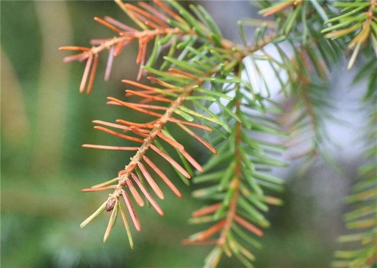 Die Nadeln von Tannen, Fichten und Douglasien werden gelb oder braun und fallen ab.