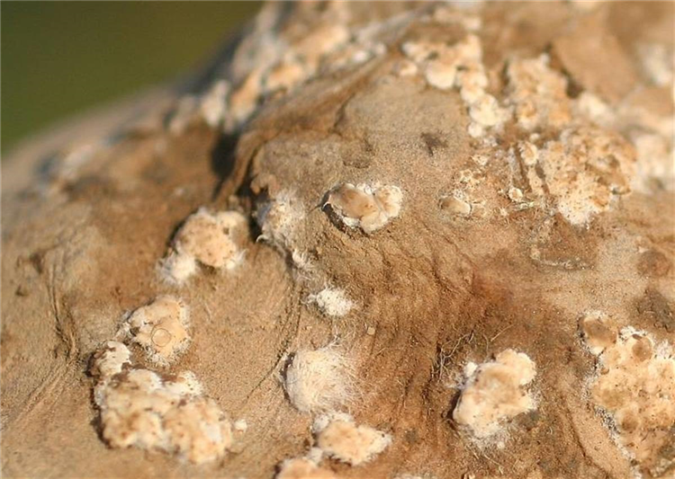 Bei den Trockenfäulen sinkt das Knollengebewebe ein und oftmal bildet sich auf der Schale Pilzgewebe mit Sporen. Ein typischer Vertreter ist die Fusarium Trockenfäule, die auch als Weißfäule bezeichnet wird.