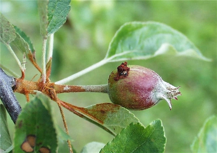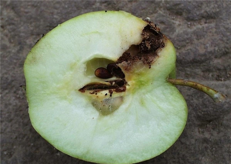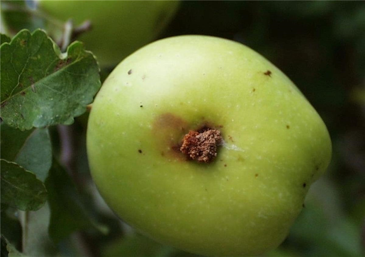 Äpfel weisen Bohrlöcher auf, die mit hervorquellenden braunen Kotkrümeln behaftet sind. Das Fruchtinnere ist von Fraßgängen durchzogen, die bis in das Kernhaus reichen.