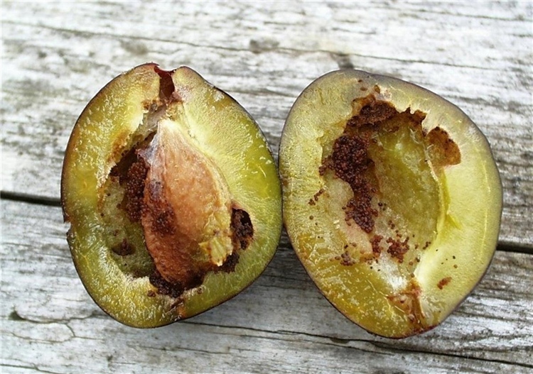 Ab Mitte Mai fliegen die kleinen, graubraunen, unscheinbaren Falter des Pflaumenwicklers (Laspeyresia funebrana) und legen ihre Eier an den jungen Früchten ab. Die frisch geschlüpften Larven bohren sich alsbald in die Frucht ein und verursachen den schon beschriebenen Schaden.