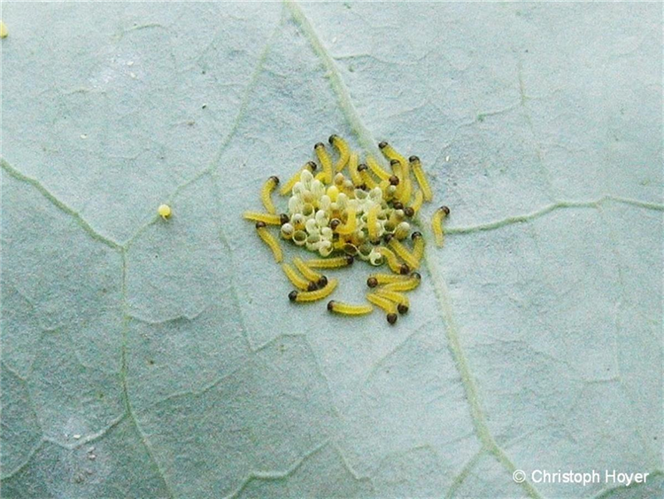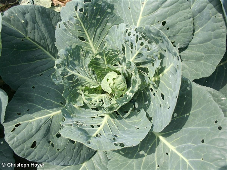 Die Blätter der Kohlpflanzen zeigen Fraßlöcher. Bei starkem Befall bleiben oft nur die Blattrippen stehen. Auffallend sind auch die grünen oder braunen Kotkrümel.