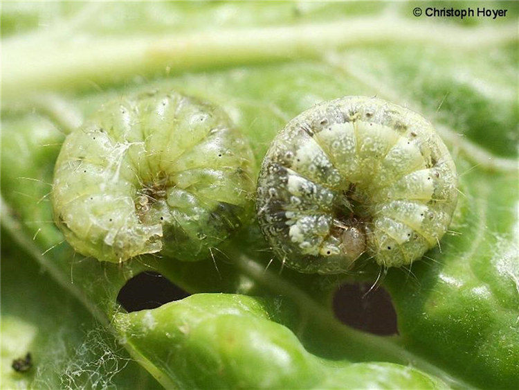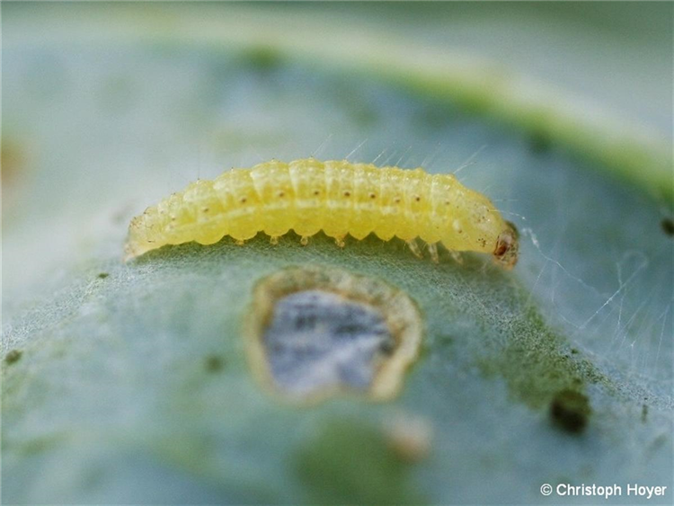 Die grünlichen Larven der Kohlmotte, die auch als Kohlzünsler bezeichnet wir, sind kleiner als die der zuvor genannten Arten. Sie führen anfangs einen Schabefraß aus. Später entstehen Löcher in den Blättern. Die Kohlmotten verpuppen sich in einen feinen netzartigen Kokon. Die Falter sind unauffällige Kleinschmetterlinge von brauner Farbe.