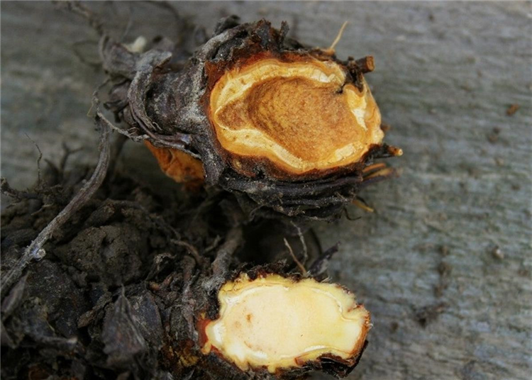 Gräbt man betroffene Pflanzen aus und schneidet den Wurzelstock (Rhizom) mit einem Messer an, fällt die rotbraune Farbe des Rhizomes auf.