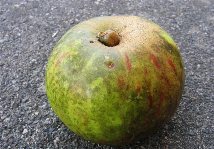 Auf reifen Früchten befindet sich ein grünlichschwarzer, rußartiger Belag. Die verwaschenen Flecken lassen sich, anders als beim Apfelschorf, von der Fruchtschale abwischen.