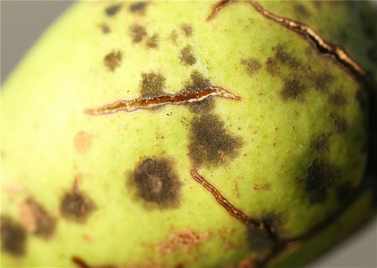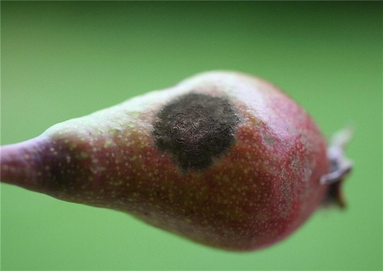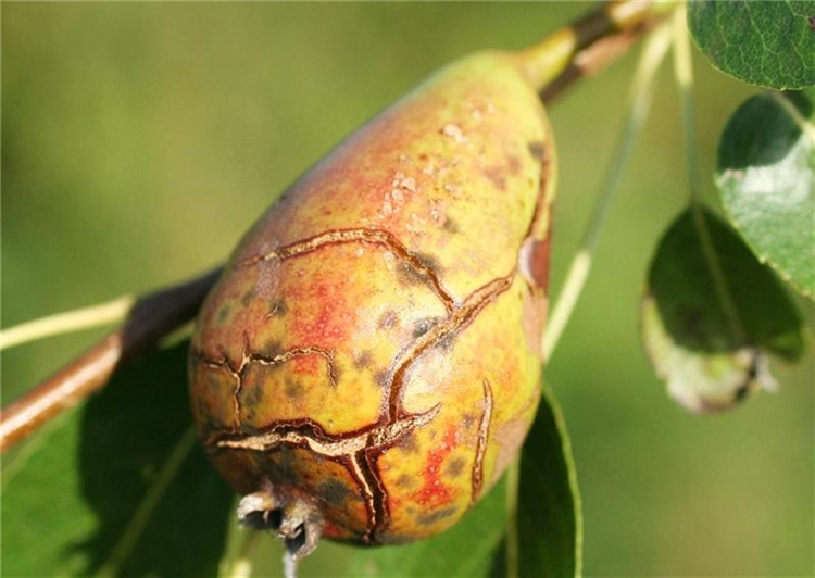 Junge Birnen sind rissig und von schwarzgrauen Schorfstellen bedeckt. Die Früchte werden meist vorzeitig abgestoßen. Ältere Früchte zeigen die gleichen rissigen Schorfstellen und sind häufig verkrüppelt.