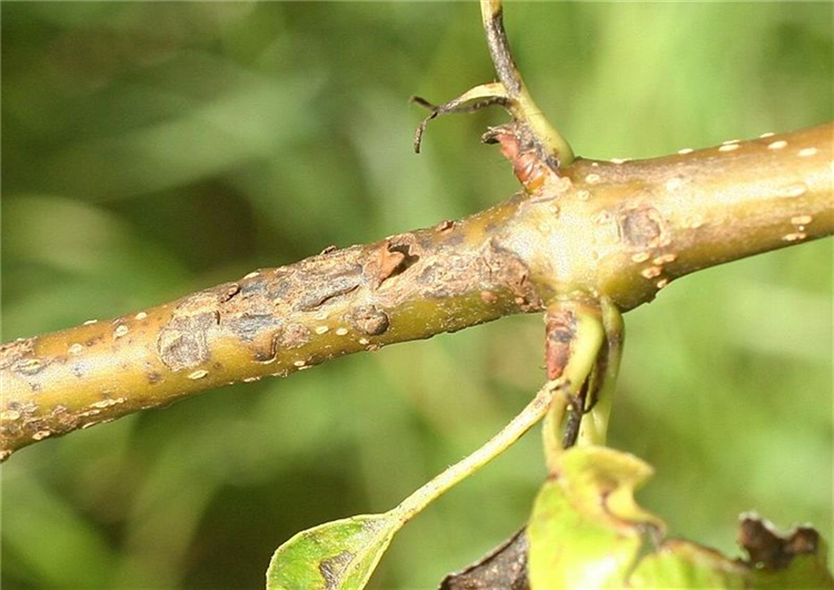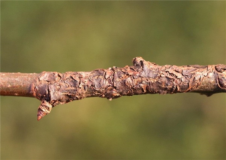 Ein weiteres Zeichen für Schorfbefall ist der sogenannte Zweiggrind junger Triebe, der durch stellenweises Aufreißen der Rinde gekennzeichnet ist. Ähnliche Symptome an den Trieben können durch den Bakterienbrand hervorgerufen werden.