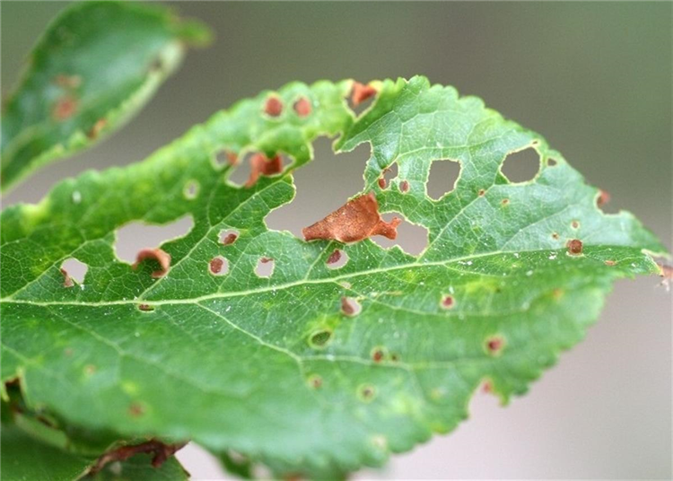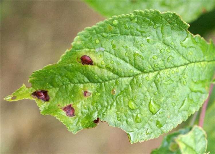 Im Mai und Juni bilden sich auf den Blättern anfänglich rotbraune Flecken, die später absterben und aus dem Blattgewebe herausfallen, so dass die Blätter unregelmäßig durchlöchert erscheinen.