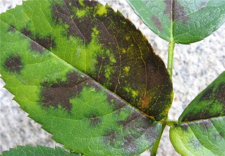 Auf der Blattoberseite bilden sich anfangs kleine, später größer werdende, schwarzbraune Flecken mit unregelmäßig begrenztem Rand. Die Blätter vergilben schnell und fallen ab, so dass die Rosen bei stärkerem Befall oftmals schon im Hochsommer entblättert sind.
