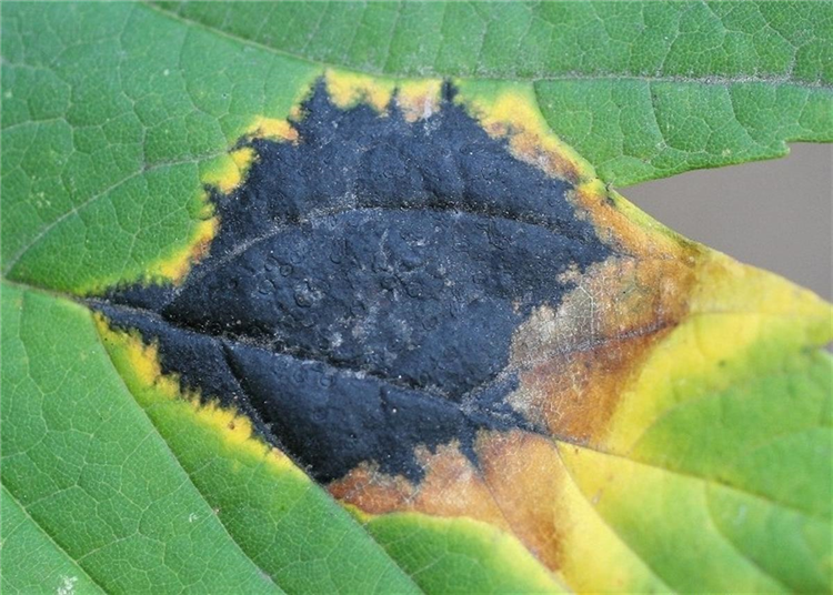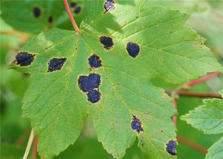 Auf den Blättern, vor allem von Spitzahorn, bilden sich im Spätsommer auffällig schwarze Flecken mit gelbem Rand. Das Blattgewebe erscheint im Bereich der Flecken ledrig verdickt.