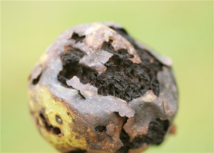 Die grüne Fruchtschale der Walnüsse verfärbt sich schwarz. Sie wird weich und schleimig. Später trocknet das Gewebe ein. In der Fruchtschale fressen die weißen oder gelben Larven der Fruchtfliege, die aber nicht in den Kern, die eigentliche Walnuss, vordringen.