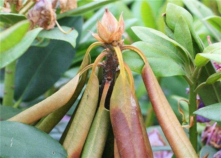 Rhododendren sterben ganz oder triebweise ab. Die Blätter verlieren dabei ihre grüne Farbe und werden fahlgrau bis braun, ohne dass sie abfallen.