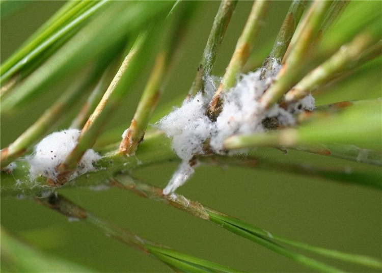 An den Nadeln, vor allem der Nadelbasis, befinden sich graue oder gelb-braune Blattläuse, die von weißer Wachswolle umhüllt sind. Ein ähnliches Schadbild können Nadelschildläuse verursachen.