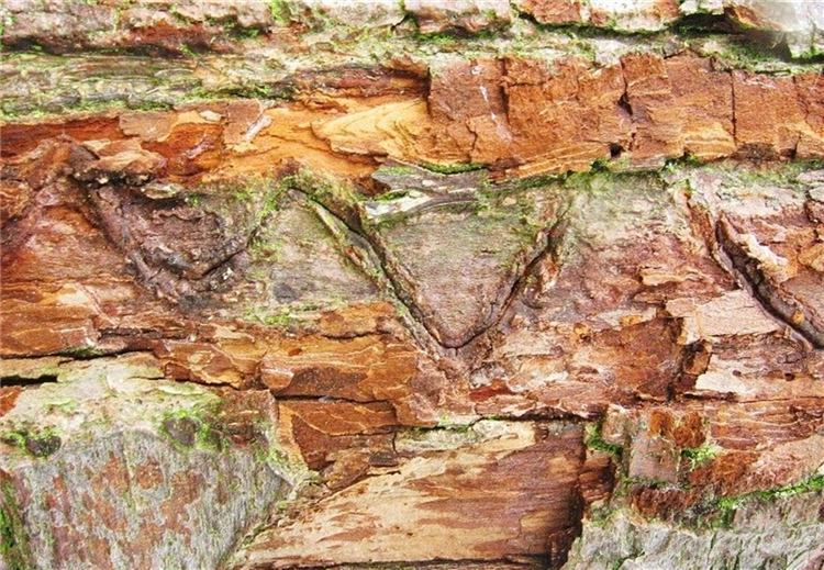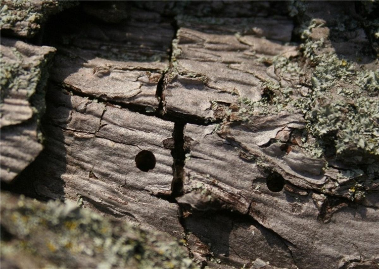 In der Borke befinden sich kreisrunde Bohrlöcher. Unter den abgestorbenen Rindenpartien kann man die zickzackförmigen Fraßgänge der Käferlarven sehen, denen dieser Schädling auch den Namen Blitzwurm verdankt.