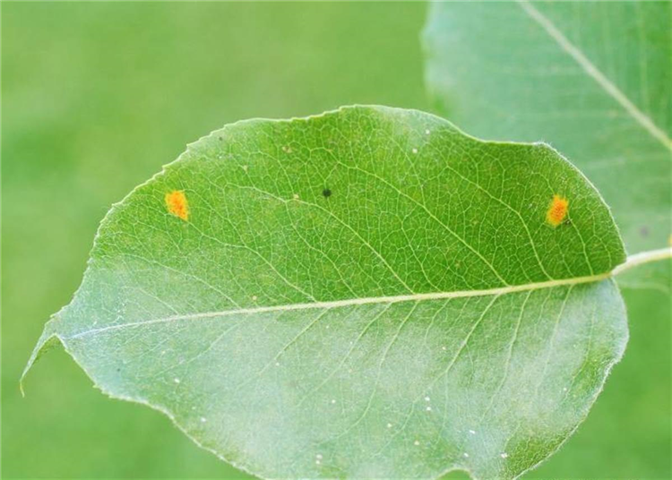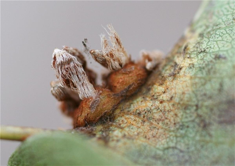 Auf den Blättern der Birne bilden sich zuerst kleine, gelbe, dann größere, leuchtend-orange Flecke. Im Spätsommer und Herbst entwickeln sich an diesen Stellen blattunterseits höckerähnliche Gebilde (Sporenlager).