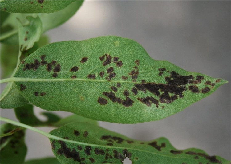 Die Blätter zeigen anfangs hellgrüne bis rötliche, später schwarzbraune, blasenartige Emporwölbungen (Pocken).