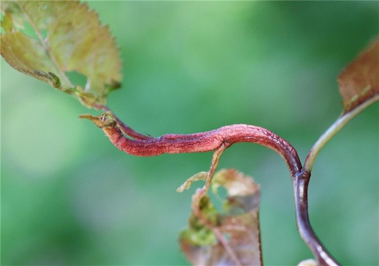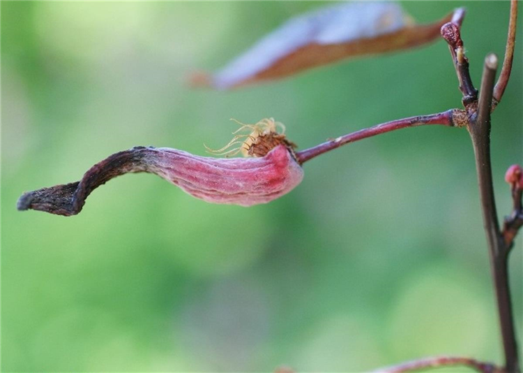 Sehr bald nach dem Austrieb im Frühjahr fallen vertrocknete Blätter zu Boden. Die jungen Triebe sind zum Teil eigenartig verdickt und deformiert.