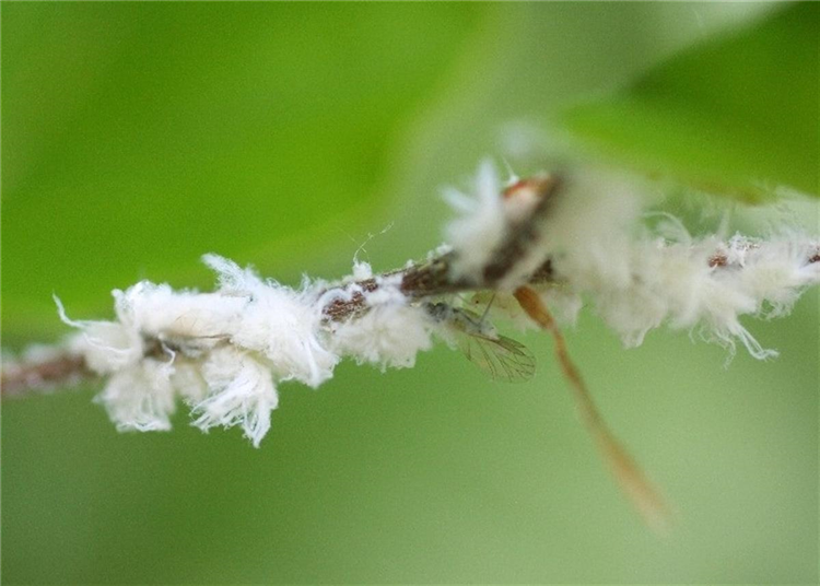 An Blättern und jungen Trieben sitzen im Frühjahr Blattläuse, die mit Wachswolle umhüllt sind. Die Blätter sind stark durch klebrigen Honigtau verschmutzt, der im Laufe der Zeit von schwarzen Rußtaupilzen besiedelt wird.