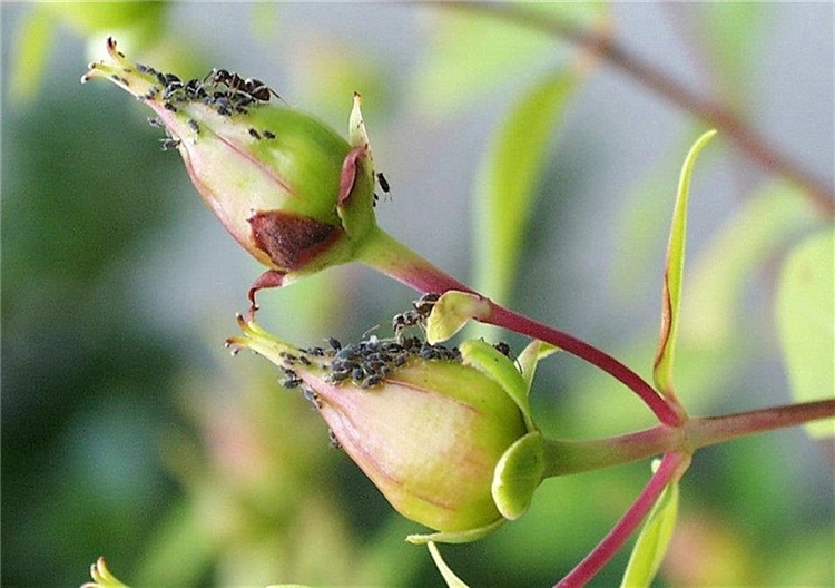 An Blättern, Trieben und auch an den Blüten sitzen schwarze Blattläuse.