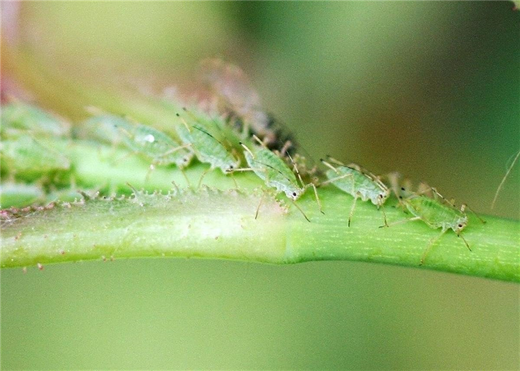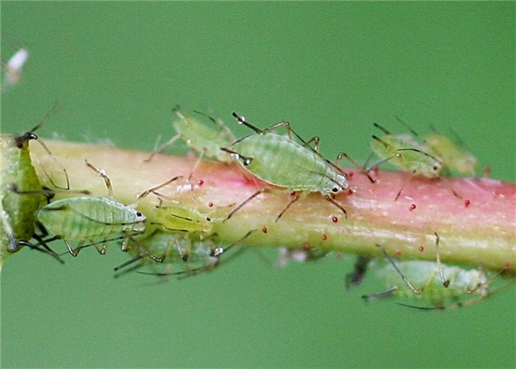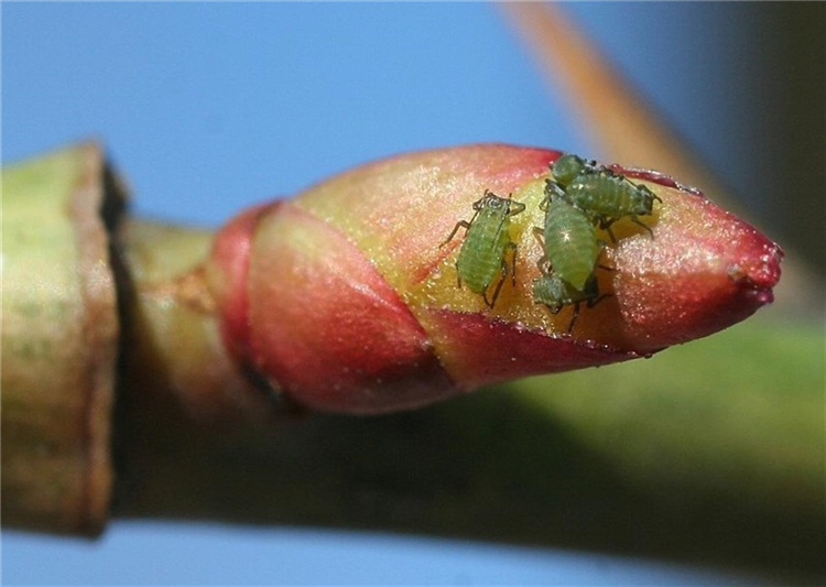 An jungen Trieben, Blütenknospen und Blättern sitzen oft dicht an dicht grüne bis rosa gefärbte Blattläuse, die die Pflanzen durch ihre Honigtauausscheidungen verunstalten.