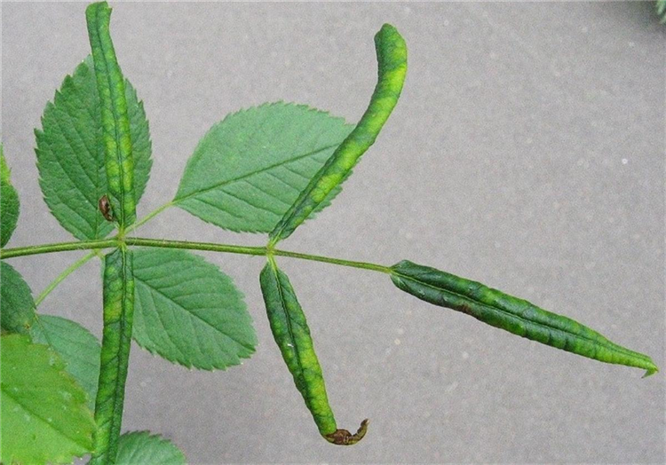 Im Frühsommer sind einzelne oder mehrere Fiederblätter der Rose entlang der Mittelrippe auffällig nach unten aufgerollt. Gelegentlich findet man in der Blattrolle die blassgrüne Larve des Schädlings.