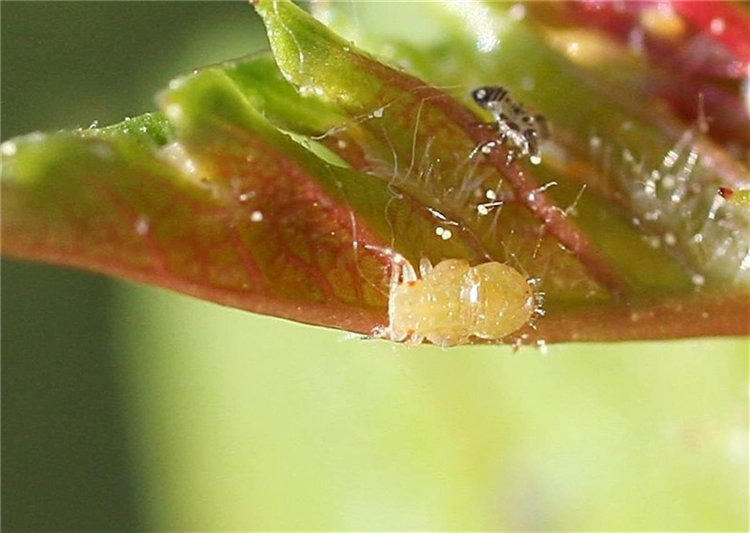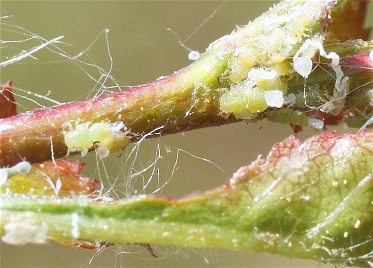 Durch die Saugtätigkeit kann es zu rötlichen Verfärbungen der Blätter kommen. Bei starkem Befall sterben die jungen Blättchen auch teilweise ab.