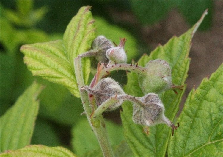 Die Blütenknospen der Himbeere knicken unterhalb des Blütenbodens ab. Am Blütenstiel, ist die punktartig Fraßstelle des Schädlings zu erkennen. Die Blüten trocknen ein.