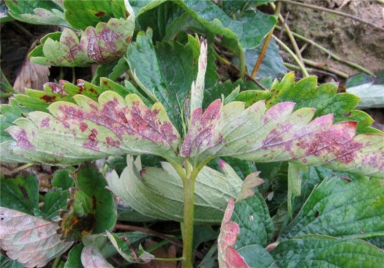 Der Erdbeermehltau (Sphaerotheca humuli) wird durch einen Vertreter aus der großen Gruppe der Mehltaupilze verursacht. Der Pilz überwintert an den Blättern.