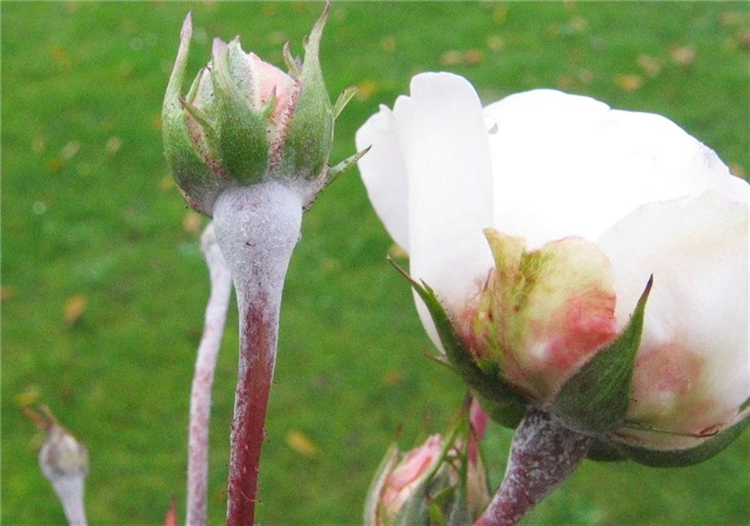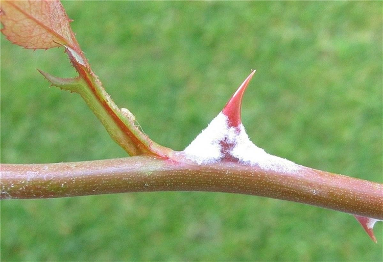 Der Echte Rosenmehltaupilz (Sphaerotheca pannosa) befällt häufig schon Anfang Mai die jungen Rosentriebe und Blätter. Er überwintert unter Knospenschuppen aber auch auf Trieben.
