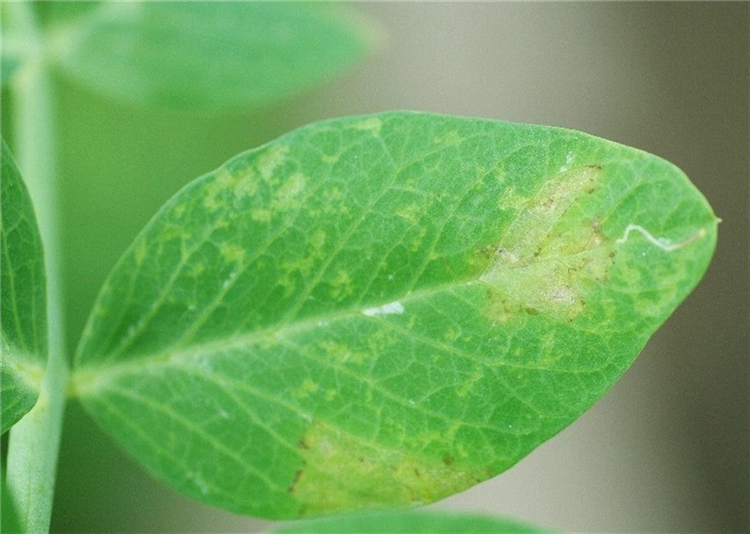 Der Falsche Erbsenmehltau (Peronospora viciae) gehört zur Gruppe der Falschen Mehltaupilze, die vor allem bei feuchter Witterung verstärkt auftreten können.