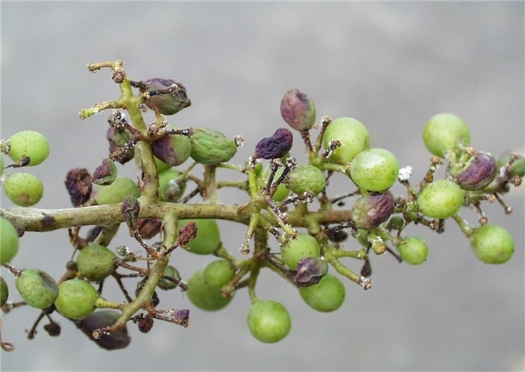 Die Blätter zeigen oberseits braune bis graue Flecken und sterben ab. Auf der Blattunterseite findet man, vor allem bei feuchter Witterung, den typischen weißen Sporenrasen. Bei stärkerem Befall kommt es zum Abwurf der Blätter. Die Beeren trocknen ein.