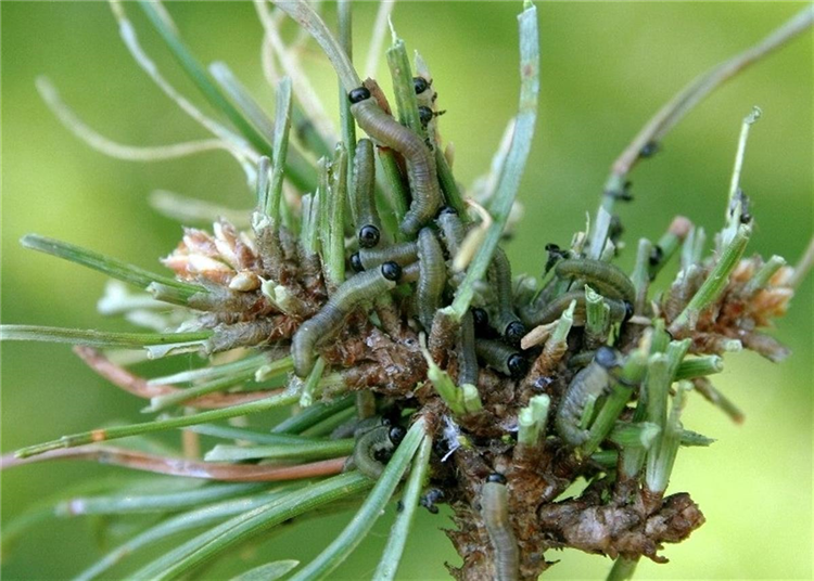 An Kiefern verursachen verschiedene Blattwespenarten Nadelfraß: Die Kiefernbuschhornblattwespe, die rot-gelbe Buschhornblattwespe und die Kiefernkulturgespinstblattwespe.