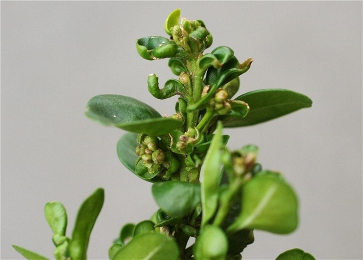 Die jungen Triebe sind an der Spitze gestaucht, die Blätter deformiert.