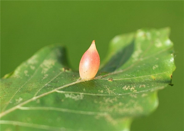 Auf der Blattoberseite bilden sich eiförmige Wucherungen von grüner bis rötlicher Farbe.