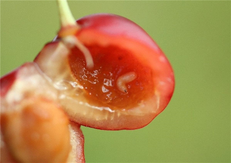 In den reifen Süßkirschen befinden sich kleine, bis 6 mm lange, weiße Maden, die das Fruchtfleisch in der Umgebung des Kerns in eine braune, faulige Masse verwandeln. Besonders gefährdet sind mittlere und späte Sorten. In seltenen Fällen werden auch Sauerkirschen befallen.
