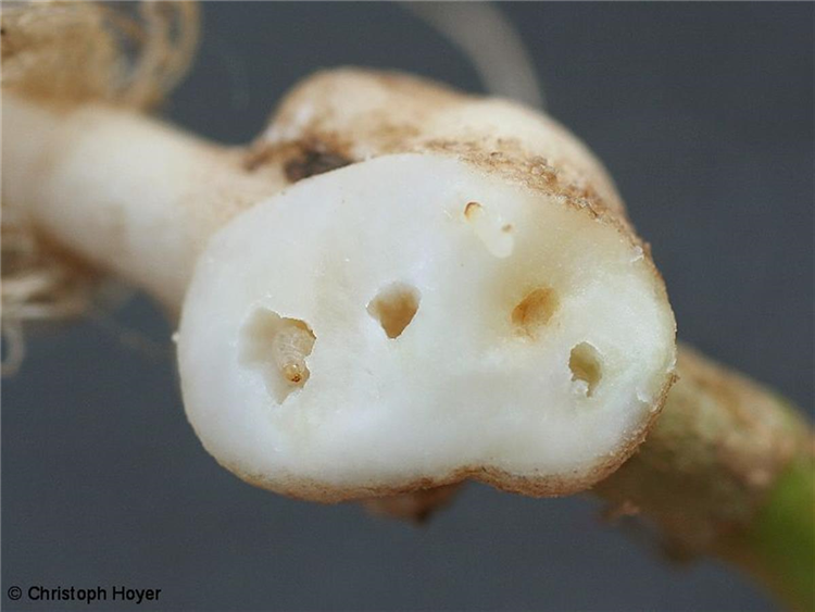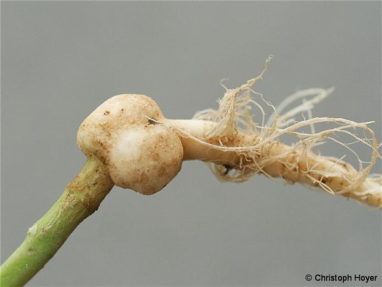 Am Wurzelhals oder direkt an der Hauptwurzel befinden sich kugelige, erbsen bis haselnussgroße Wucherungen (Gallen). Bei Kohlrabi können diese Gallen gelegentlich auch im unteren Knollenbereich auftreten.